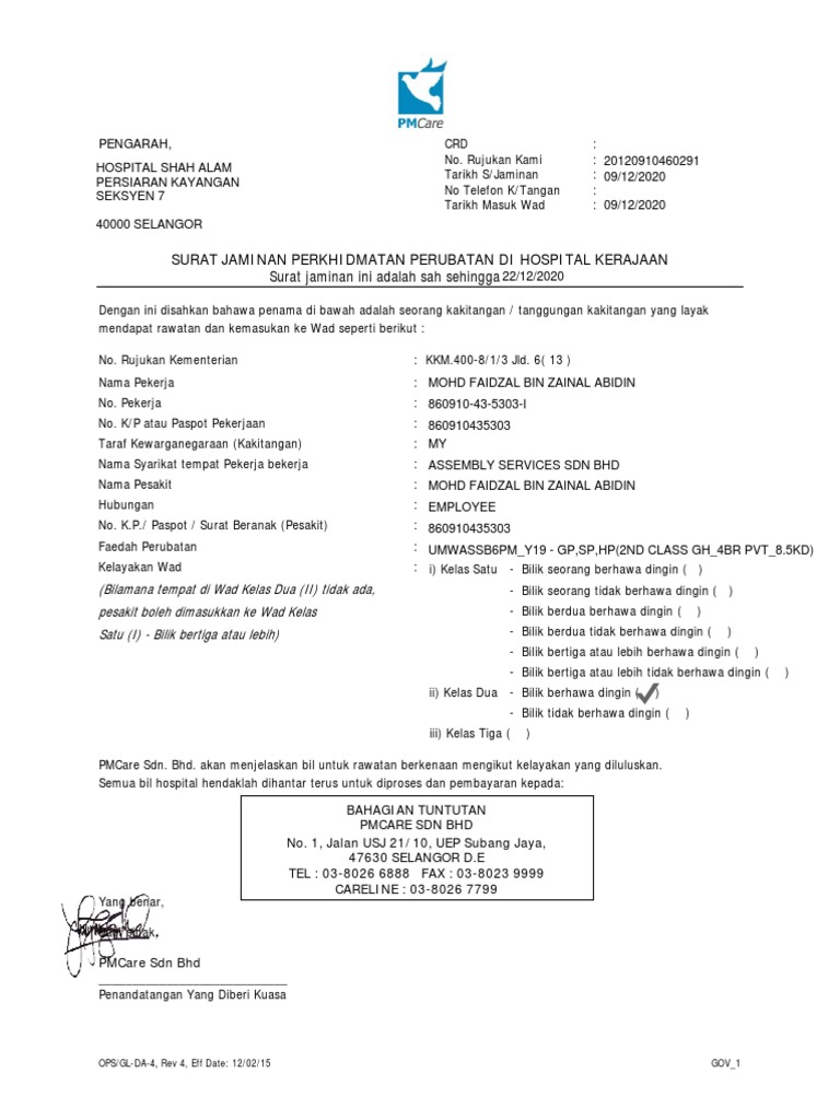 Surat Jaminan Perkhidmatan Perubatan Di Hospital Kerajaan Pdf